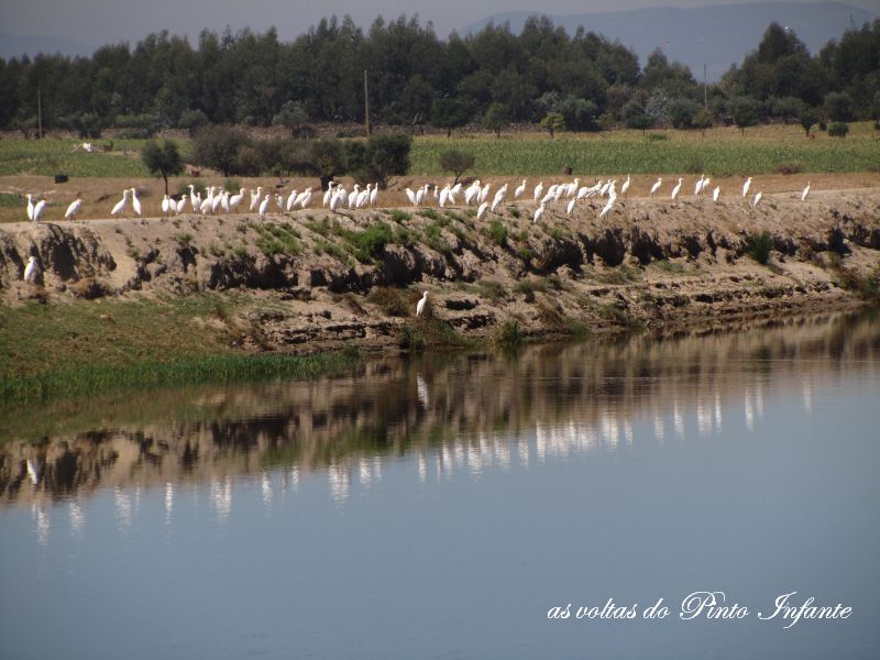 Numa outra barragem bem perto do Ribeiro da Azinheira cruzei-me mais uma vez com este bando de aves, os carraceiros que em sua plenitude dão colorido a uma beleza de Verão, este ano algo esquisito. Uma cor branca que contrasta com o azul desta barragem por onde vamos passar no Passeio Pedestre a realizar dia 2 de Outubro na Feira do Feijão Frade, na Lardosa.